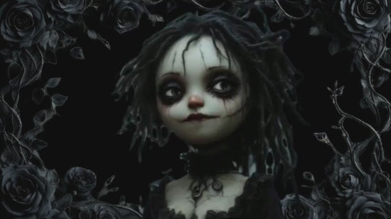 Promised to Death himself! Annie fled her fate and was bound in twilight. Neither living nor dead, she roams fog-laced alleys in her eternal bridal gown, her smile cracked, her eyes ever watching. The veil of mortality wears thin when she passes. The line between reality and the supernatural blurs as our doll reveals it's been watching. This spooky encounter reminds us that appearances can be deceiving, especially in the gothic world. Embrace the darkness and the scary stories that come with it.