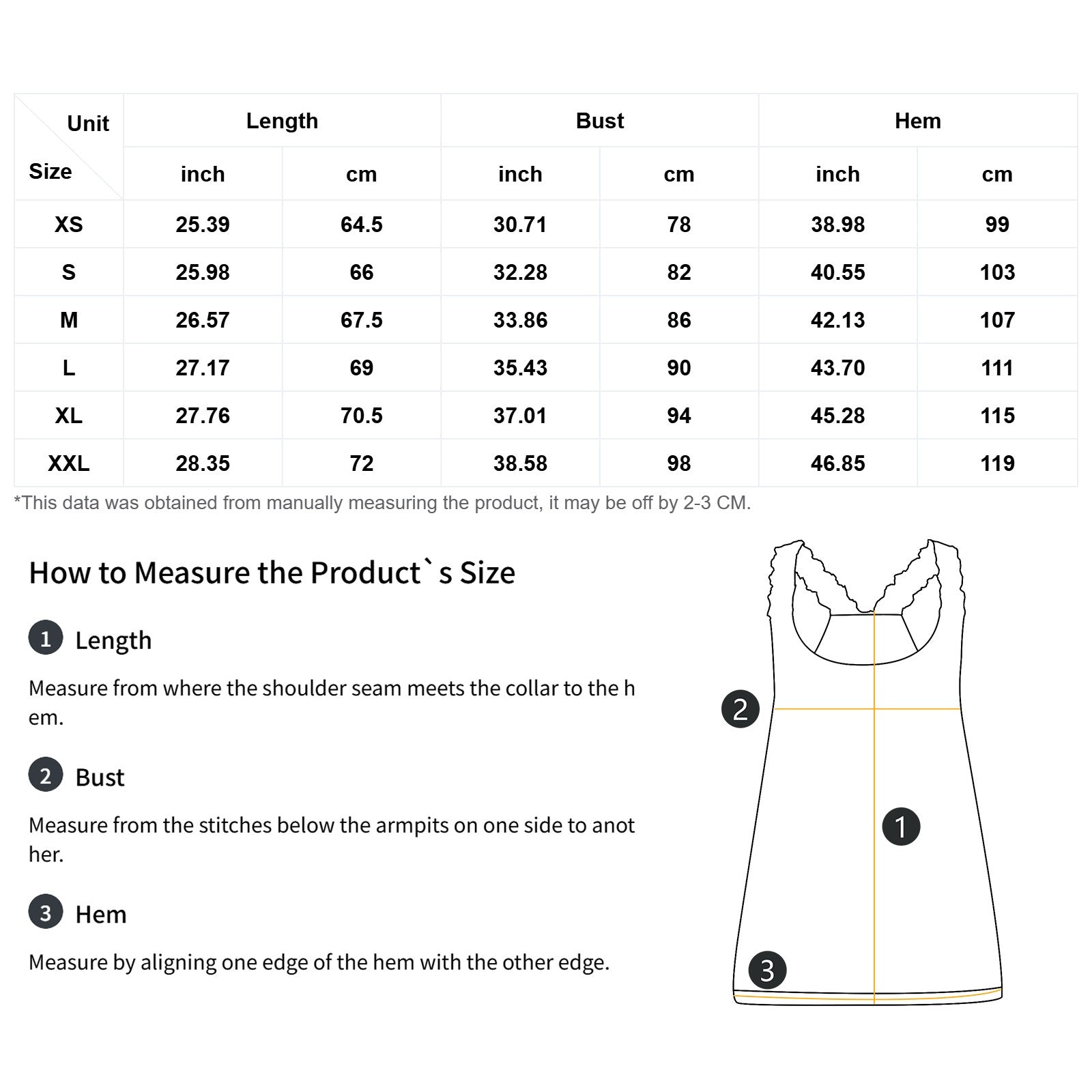 The measurement data of this size is obtained by laying clothes flat. Due to different measurement methods, it is normal that the error is within 2-3cm.