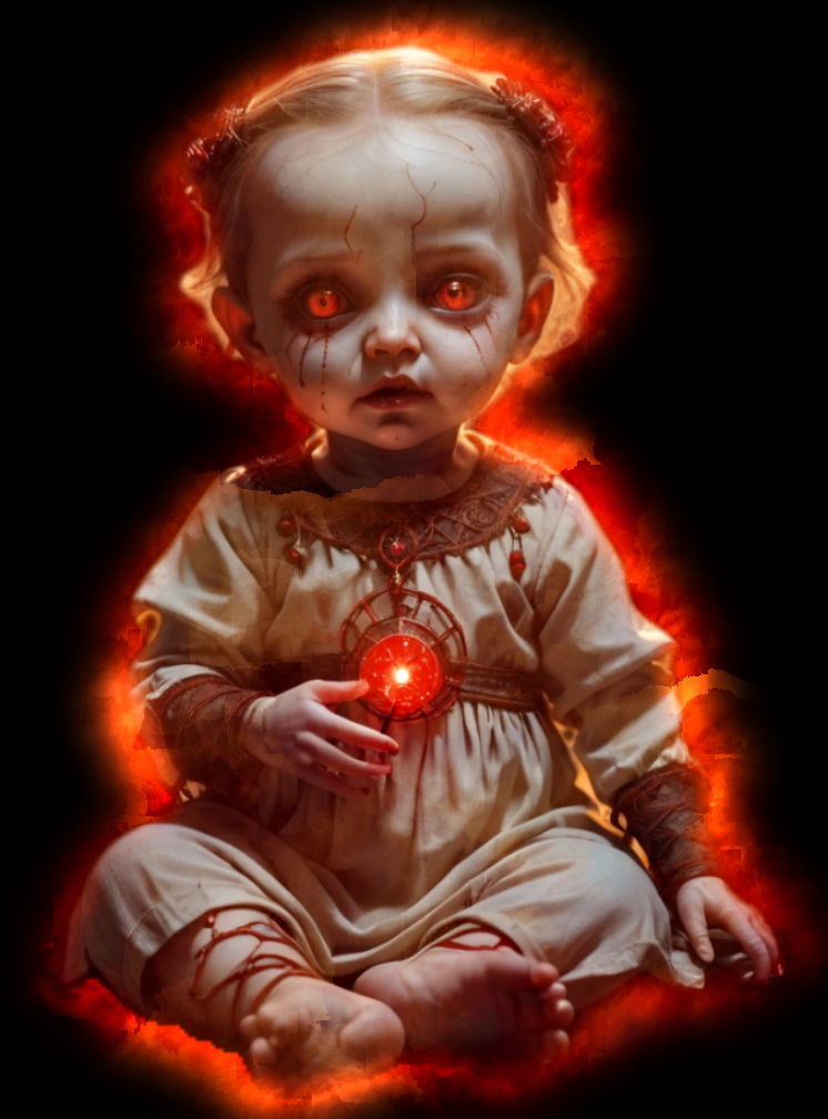 At night, she scrawls ancient runes in ash and bone dust on nursery walls—spells not meant for living minds. Her lullabies play backward, sweet and ghastly, echoing softly… even when she isn’t there. She's not waiting to be loved. She's waiting to be obeyed.