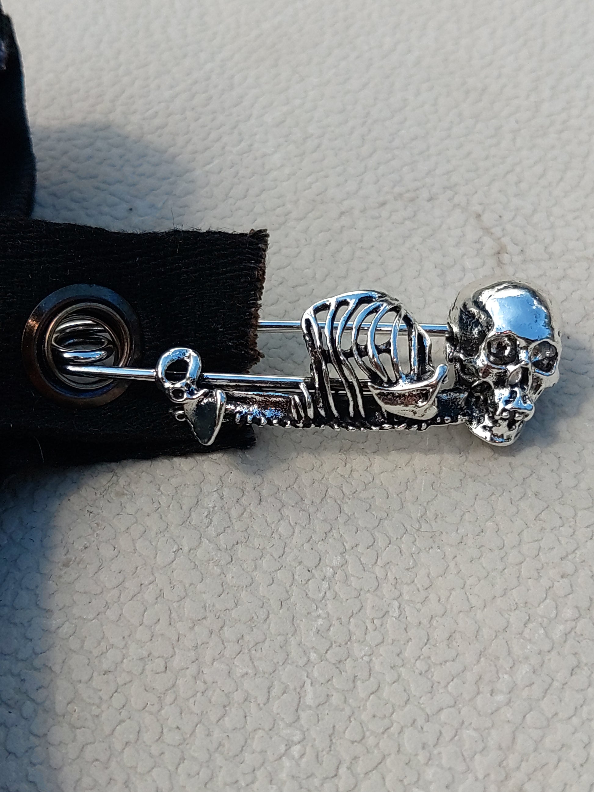 Backed in black cotton denim and topped with copper grommets and a silver skeleton pin, this mini tote clips right to your outfit or bag — no straps, just attitude.